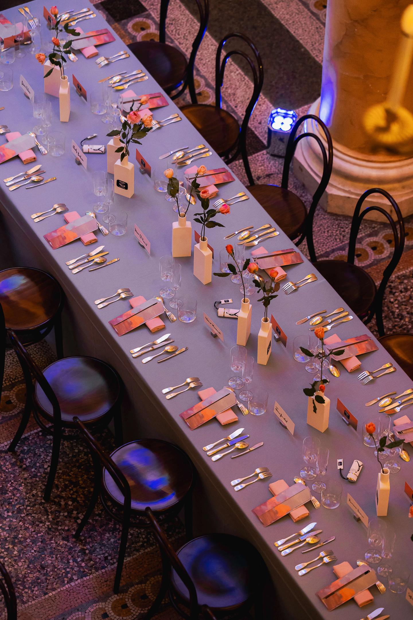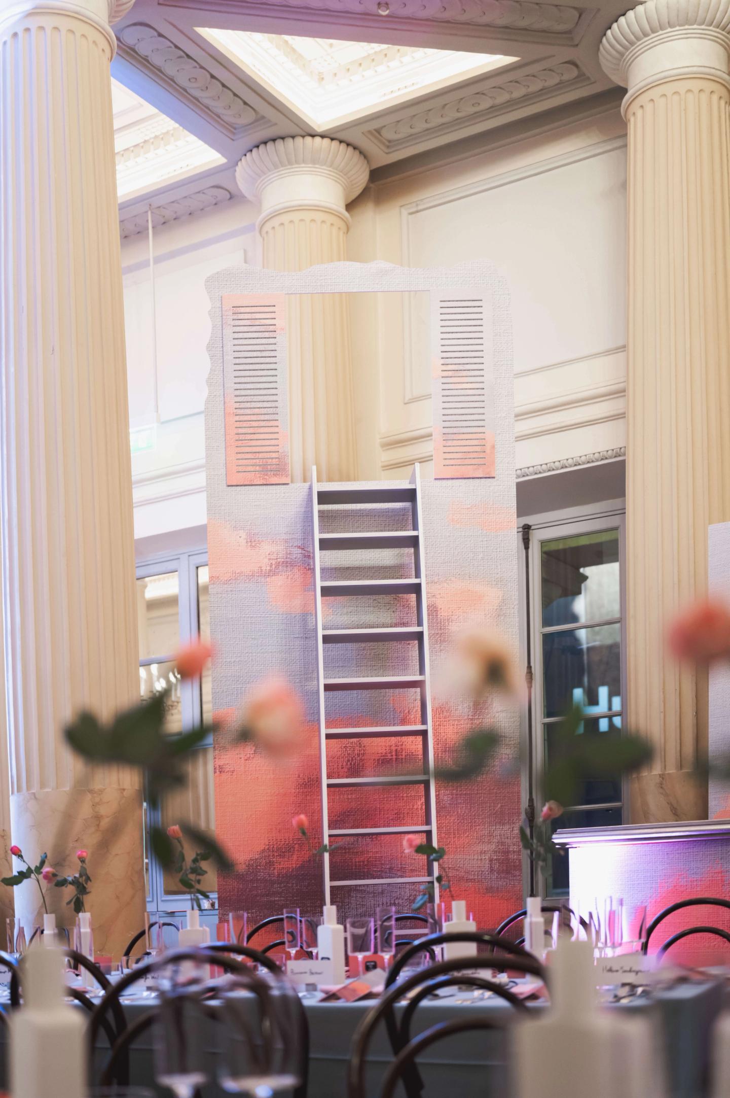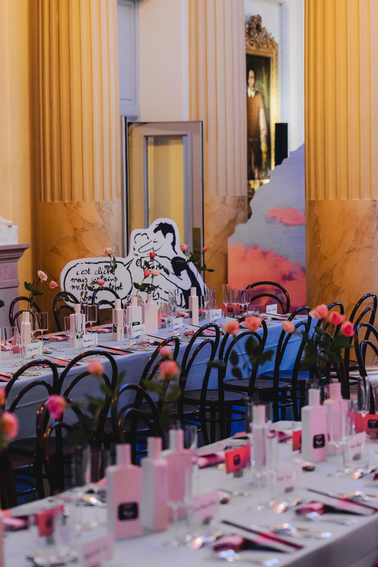 The scenography was conceived as a theatrical set, immersing guests in a dreamlike interpretation of the fragrance’s universe. From the layout of the space to the table elements, every detail contributed to a narrative both playful and refined.