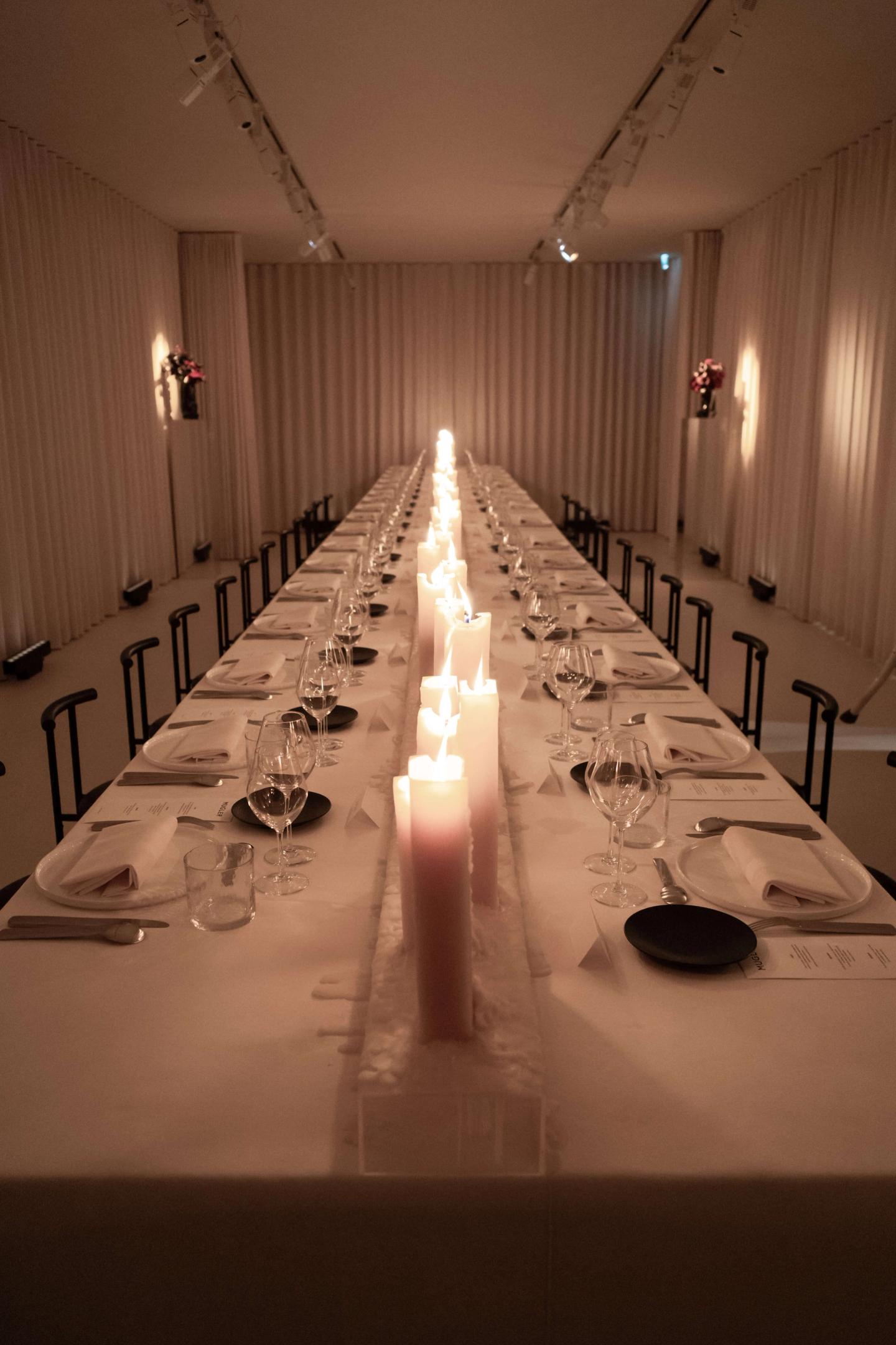 The scenography translated Mugler’s striking visual language into a refined culinary experience. Custom-made table elements and carefully curated materials echoed the brand’s architectural silhouettes, while the interplay of textures—glossy, matte, structured—enhanced the connection between fashion and gastronomy. A result of extensive research and development, this immersive encounter captured the Mugler spirit, transforming dining into a moment of pure creative expression.